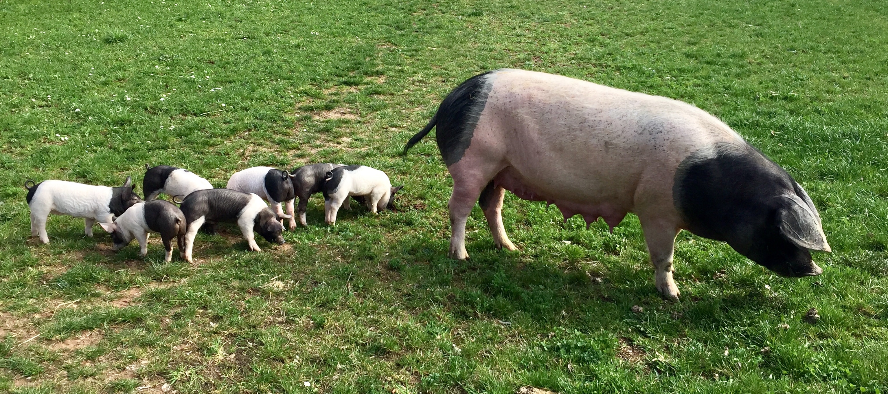 Depuis 2013 nous avons ajouté cette corde à notre arc en commençant une activité de reproduction. Pour cela nous avons fait l'acquisition de jeunes truies de la race Schwäbisch-Hall et d'un verrat Piétrain. Après une préparation minutieuse des box paillés réservés à la mise bas, nous avons installé nos premières truies sur l'exploitation à la fin de l'hiver 2012-2013.