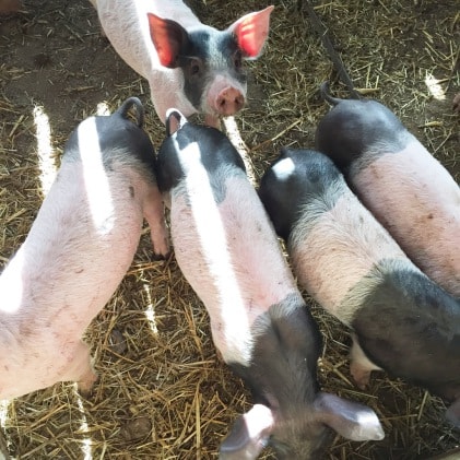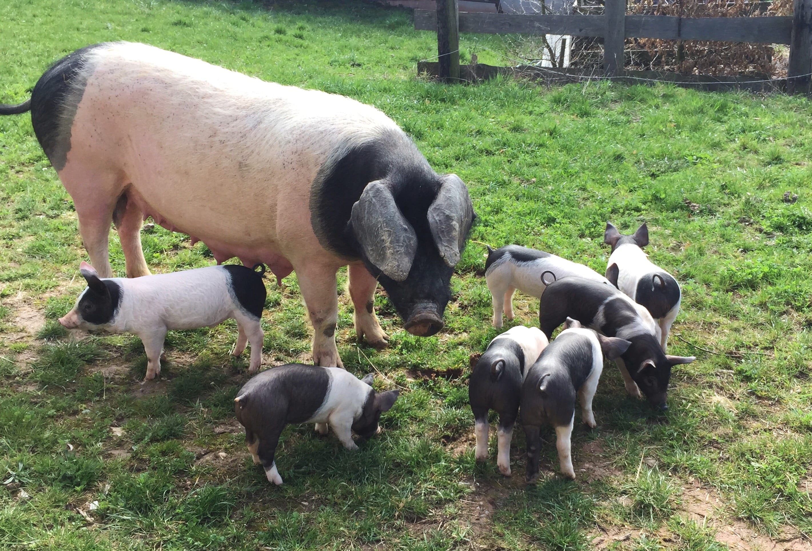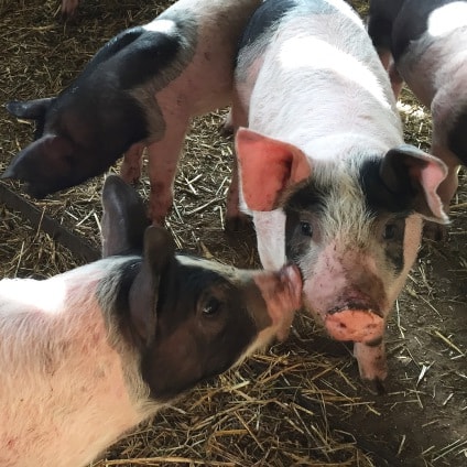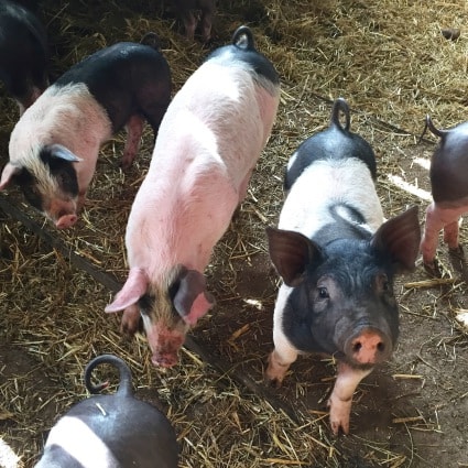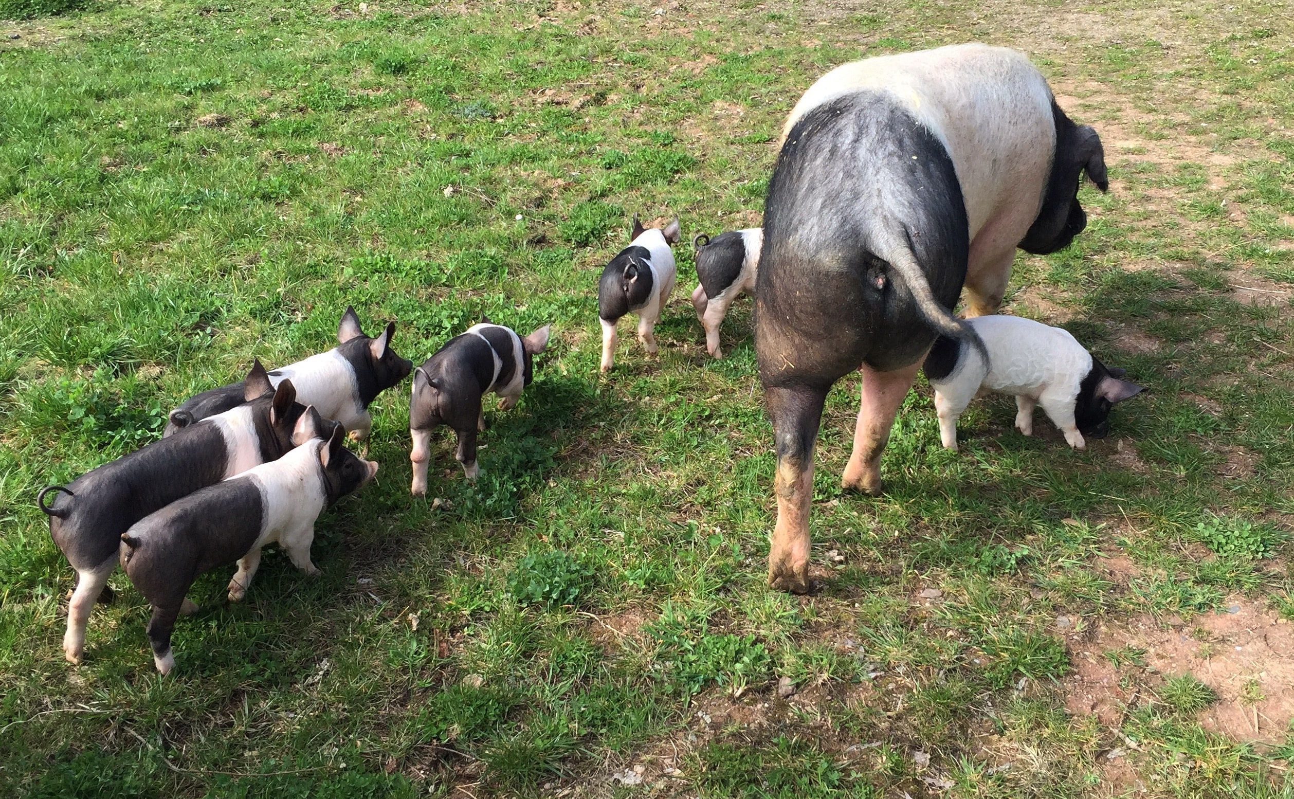 Nous élevons ces truies de la race Schwäbisch-Hall pour la reproduction de nos cochons destinés à l'élevage ; nous avons choisi cette race car elle est réputée pour avoir de nombreuses qualités (variété à croissance lente, tempérament calme, très bonne mère, etc.). Nous les faisons mettre bas une fois par an en box paillés.